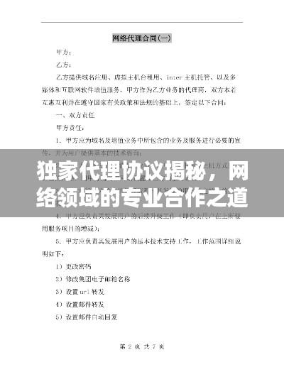 随着信息技术的快速发展,网络业务在全球范围内日益普及,网络独家代理协议作为规范网络业务合作的重要文件,对于保障双方权益、明确责任义务具有至关重要的作用,本文将详细介绍网络独家代理协议的主要内容及其意义。