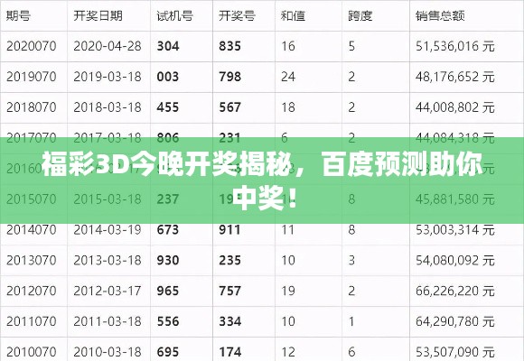 随着科技的进步和互联网的普及,越来越多的人开始关注彩票开奖信息,福彩3D作为一种备受欢迎的彩票游戏,其开奖号码更是牵动着无数人的心弦,本文将为你介绍如何通过百度轻松获取福彩3D今晚开奖号码,助你成为幸运之星!